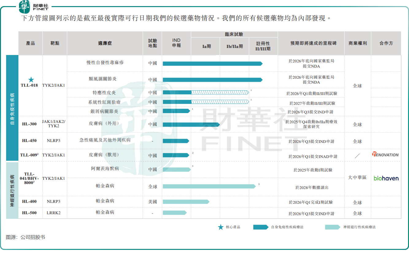 根据招股书,公司已构建覆盖多种自身免疫性疾病及神经退行性疾病适应症的差异化产品管线,包括四款临床阶段候选药物(即核心产品TLL-018、HL-300、TLL-041及HL-400)以及三款选定临床前候选药物(包括HL-450、TLL-009及HL-500)。