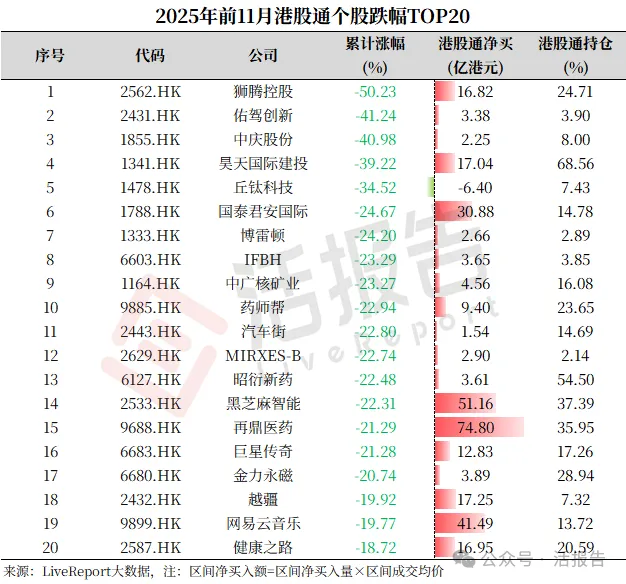 港股通表现靠后的个股包括狮腾控股、佑驾创新、中庆股份、昊天国际建投、丘钛科技等,其中狮腾控股年内股价遭腰斩,南向资金在此期间大幅增仓近17亿港元,持仓占比升至24.7%。