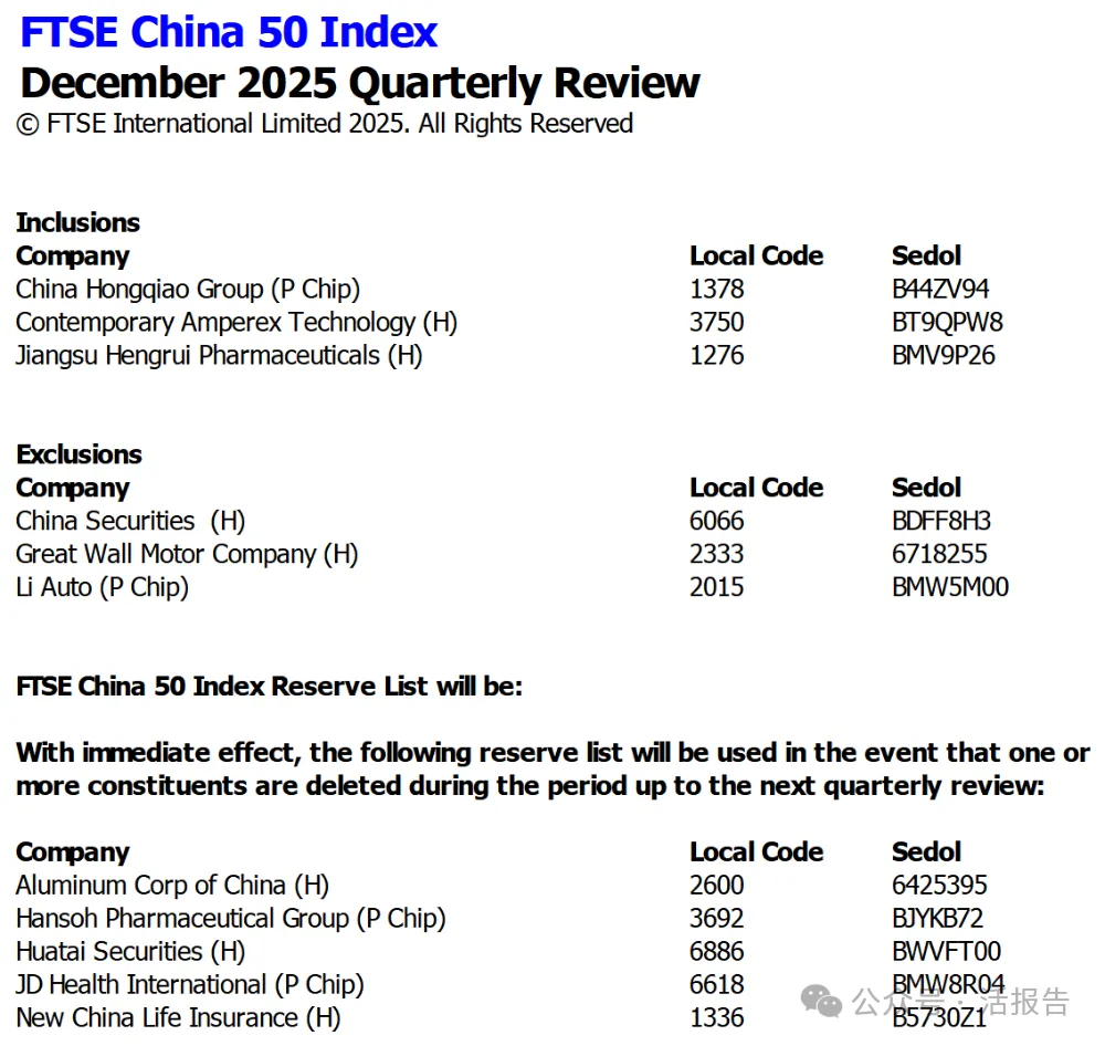 另外,2025年12月3日富时中国50指数亦公布调整,将纳入宁德时代(3750.HK)、恒瑞医药(1276.HK)、中国宏桥(1378.HK),并剔除中信建投证券(6066.HK)、长城汽车(2333.HK)、理想汽车-W(2015.HK)。
