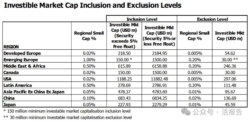 此外,可投资市值需满足对应区域小盘股整体市值的0.1%以上。自由流通比例>5%的中国股票,可投资市值最低纳入门槛为6.83亿美元(约53亿港元),自由流通比例≤5%,则为68.34亿美元。