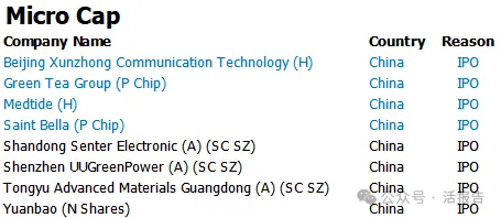小盘股纳入1只中国股票,为港股的映恩生物-B(9606.HK),该公司于2025年4月15日在香港上市。对于12月份的季度调整而言,审核市值截至日为2025年10月30日,因此公司已满足上市至少3个月的要求。
