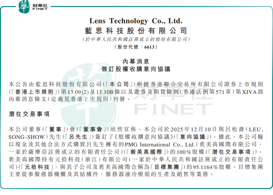 12月10日,蓝思科技发布公告,公司与吕松寿先生签订了《股权收购意向协议》,拟以现金及其他合法方式收购其持有的裴美高国际100%股权。裴美高国际持有元拾科技,与其子公司及裴美高国际合称为「目标集团」)的95.1164%股权。