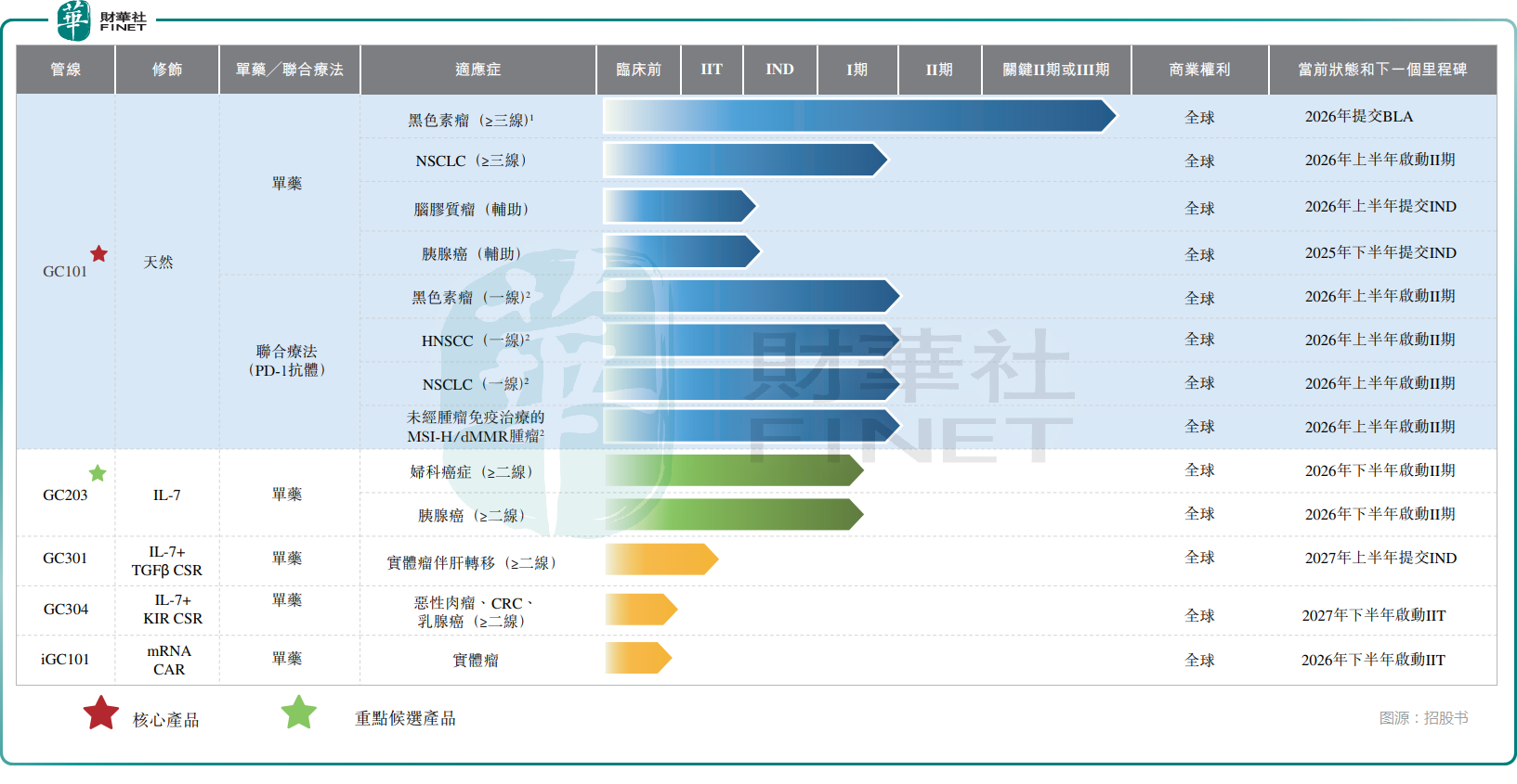 目前,GC101用于治疗黑色素瘤的临床试验正在开展关键II期临床试验,预计将于2026年提交生物制品许可申请(BLA);GC101用于治疗非小细胞肺癌的临床管线目前处于Ib期临床;多适应症的早线联合治疗和术后辅助治疗也已布局,如下图所示。