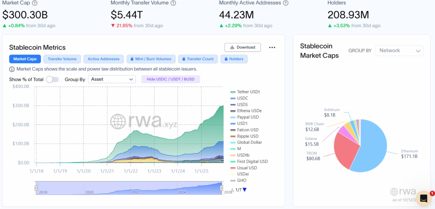 稳定币总市值达3,003.00亿美元,环比上月同期微涨0.84%,增速仍处低位,整体规模进入低速扩容阶段;然而,关键流动性指标显著恶化:月度转账量骤降至5.44万亿美元,环比上月同期大幅下滑21.85%;同时,月活地址总数回落至4,423万,环比上月同期微跌2.29%;持有者总数稳步增长至约2.09亿,环比上月同期微增3.53%,形成强烈背离,反映市场正面临 “流动性收缩与用户活性衰退” 的双重压力。市值虽勉强维系,但实际资金周转效率与链上交易活跃度正快速下降,反映出支付结算需求减弱或资金流出链上体系。数据表明,市场可能已从“存量优化”阶段转入 “流动性衰减” 通道。头部稳定币为USDT、USDC及USDS,其中USDT市值环比上月同期微涨1.99%;USDC市值环比上月同期微增0.58%;USDS市值环比上月同期上涨3.52%。