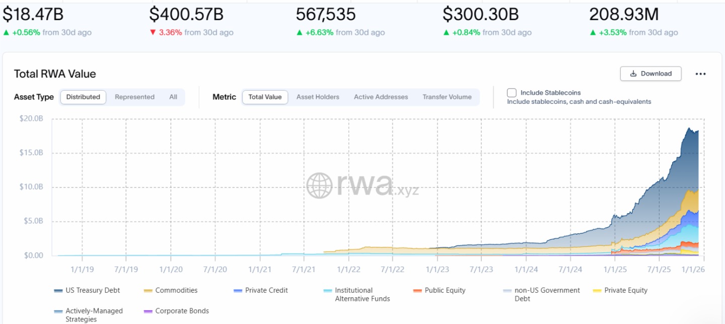 RWA.xyz 最新数据披露,截至2025年12月12日,RWA 链上总市值为184.70亿美元,环比上月同期微增0.56%,增速大幅放缓接近停滞;资产持有者总数稳步增长至约56.75万,环比上月同期上涨6.63%,反映投资者基数持续扩大。
