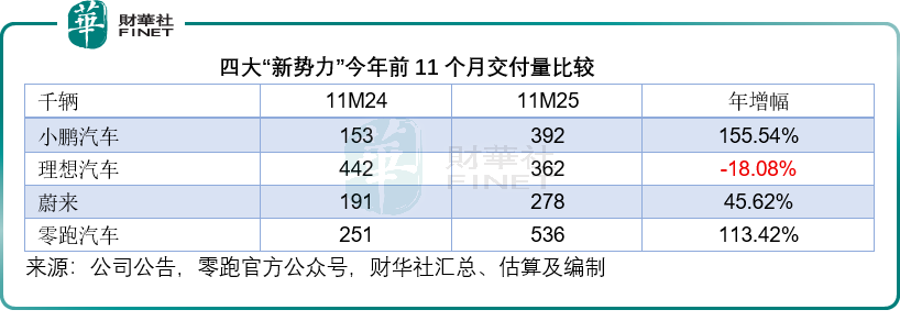 若以交付量增速论英雄,今年的格局出现了戏剧性扭转。小鹏汽车(09868.HK)一马当先,前11个月累计交付39.19万辆,同比激增155.54%,增速在四家中拔得头筹。其8月焕新上市的P7车型及持续迭代的G6、G9系列,提供了强劲推力。