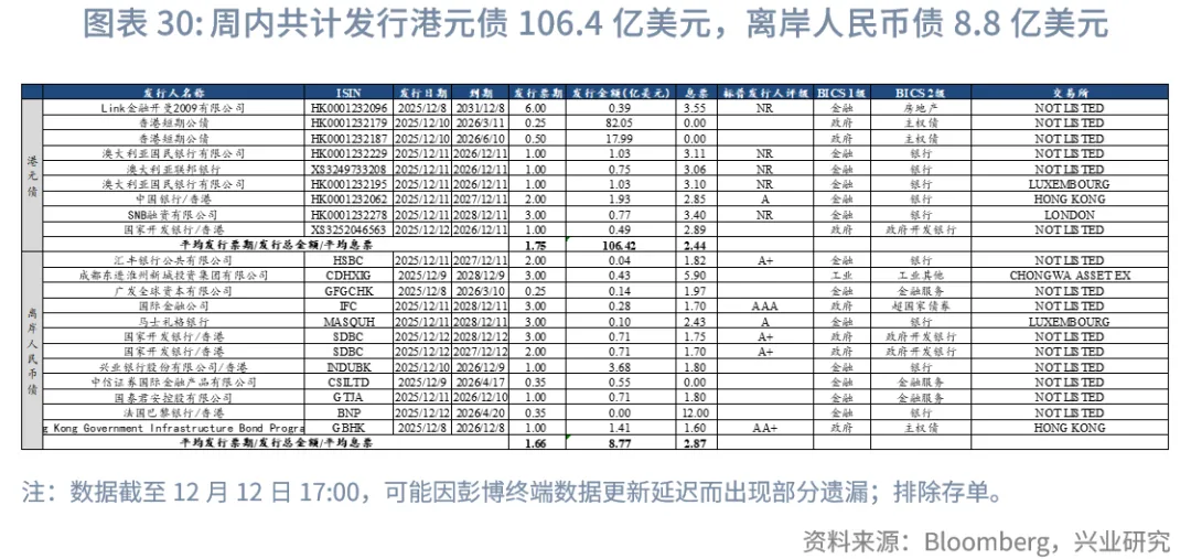 一级市场方面,本周港元债共计发行9只,发行金额换算成美元为106.4亿,其中香港金管局发行100亿美元外汇基金票据。本周离岸人民币债发行12只,发行金额换算为美元为8.8亿。