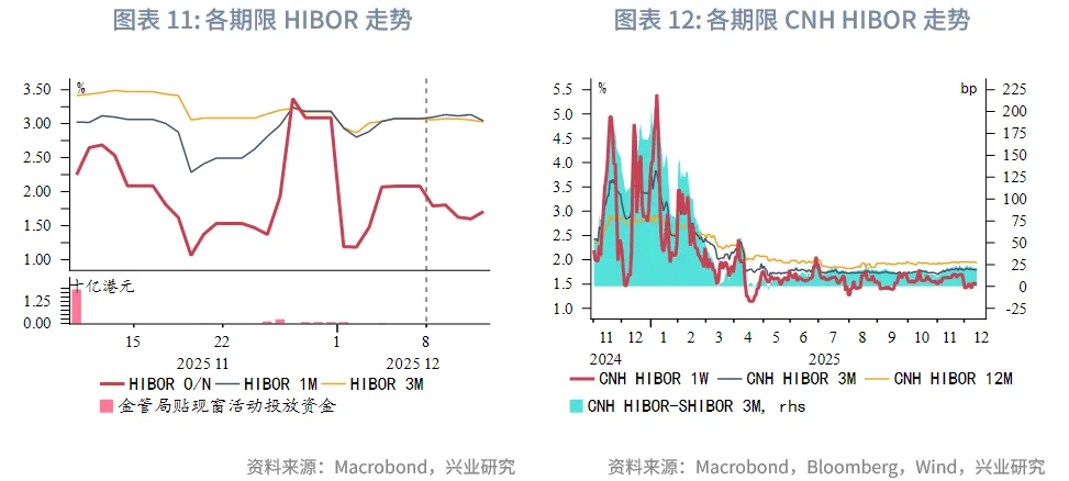 港元资金面:本周港元资金面整体平稳。隔夜HIBOR回落37bps,1个月、3个月HIBOR基本持平,仅波动3bps左右。同期,1个月和3个月期限的港美利差也保持稳定,仅小幅波动2bps左右,目前维持在100bps左右。展望后市,日本央行下周可能的加息行动值得关注,但当前市场对其已有较充分定价,预计其对港元流动性造成的直接冲击整体可控。若加息幅度和指引超出市场预期,可能引发全球日元套息交易的阶段性平仓和资金回流,可能对 HIBOR(尤其短端利率)造成的上行冲击。