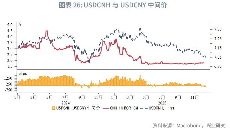 在美联储偏鸽基调和重启购债计划的背景下,美元指数走低,一度跌至98.10附近。在亚太货币中,泰铢表现最佳。虽然泰国经济仍面临挑战、泰柬边境再起冲突、泰国总理本周宣布提前选举,但泰铢或受黄金影响而持续走强,创2021年年中以来的最强水平。随着新西兰央行暗示宽松周期接近尾声,国内经济复苏迹象逐步显现,新西兰元近期表现不俗。澳元本周小幅上行,澳联储偏鹰的前瞻指引支撑澳元兑美元升值,但随后11月偏弱就业数据拖累澳元,回吐部分涨幅。马来西亚林吉特兑美元汇率创四年多来的最高水平,反映出市场对其经济前景、以及其与全球科技周期联动效应的乐观态度。韩元本周延续了最近的贬值趋势,由于资金持续流出股市及居民海外投资增加,韩元本季度已贬值超过4%。作为拥有约5,450亿美元海外资产的韩国最大机构投资者,国民年金公团(NPS)或将加大外汇操作来帮助缓解韩元压力。港元兑美元本周在7.78-7.7850区间波动,未来如果联储持续降息和港股市场交投改善,港元仍有较大概率逼近强方兑换保证。本周人民币兑美元持续升值,离岸和在岸人民币的汇差也再次负向走阔,显示市场增强对人民币未来升值的预期。