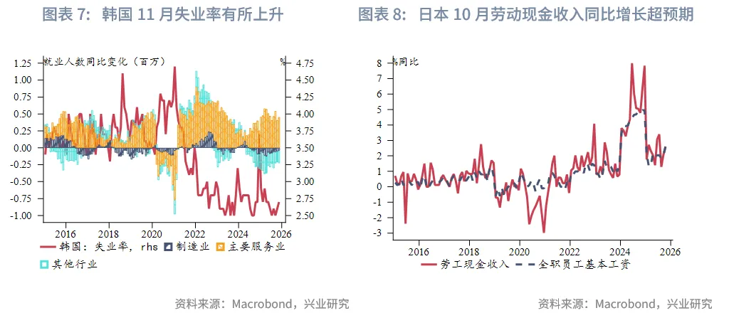 日韩:尽管11月有所上升,但韩国失业率仍处于低位,预计韩国央行维持当前利率不变。经季节性调整的失业率11月小幅上升0.1个百分点至2.7%。政府就业计划支持下的卫生与社会仍是创造就业的主要部门,11月新增28.1万个岗位。建筑业和制造业持续裁员,分别减少13.1万和4.1万个岗位。尽管私营部门的就业增长缓慢,劳动力市场或比失业率看起来脆弱,但出于对地产过热的担忧、以及AI对出口和经济的拉动,韩国央行当前并无急于改变政策利率的理由。日本10月工资增速加快或增强日本央行在12月18—19日会议上加息25个基点的可能性。劳动现金收入同比增长2.6%,高于9月修正后的2.1%和预期值2.2%。经通胀调整后,工资下降0.7%,降幅小于9月的1.3%和预期值1.2%。作为备受日本央行关注的指标,同样本基本工资同比涨幅放缓0.1个百分点至2.2%。目前市场预计日本央行加息25bp的概率已达约90%。