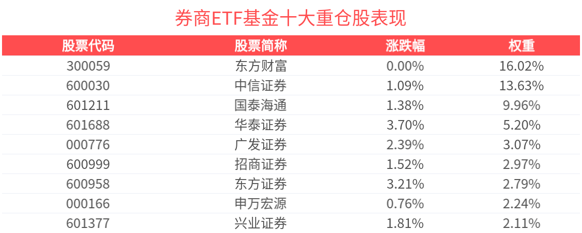 券商ETF基金紧密跟踪中证全指证券公司指数,截至2025年11月28日,指数前十大权重股分别为东方财富、中信证券、国泰海通、华泰证券、广发证券、招商证券、东方证券、兴业证券、申万宏源、中金公司,前十大权重股合计占比60.23%。