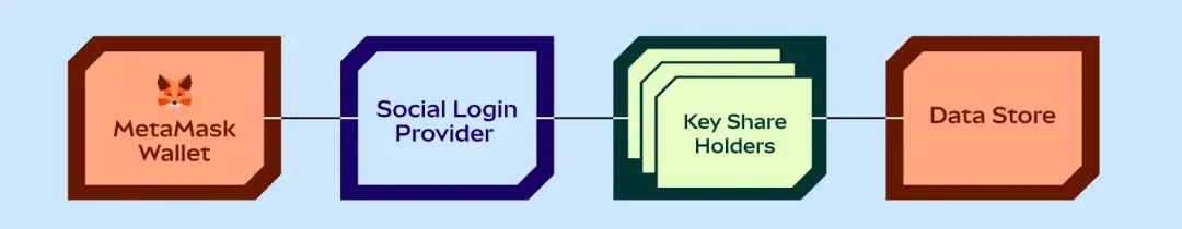 然后这个TOPRF 通过典型SSS(Shamir Secret Sharing,秘密分享算法),分片分发出去。而这些社交登录的服务商则会通过社交验证得到加密数据,还要结合用户的密码才能完全解密。