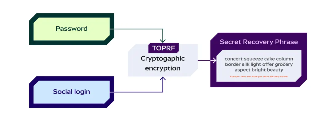 他的做法很简单,用户要登录一个邮箱并且设置一个密码,两者结合形成一个叫TOPRF(Threshold Oblivious Pseudorandom Function 阈值不经意伪随机函数)的东西,用这个去加密了用户的私钥,被加密的私钥自然可以备份。