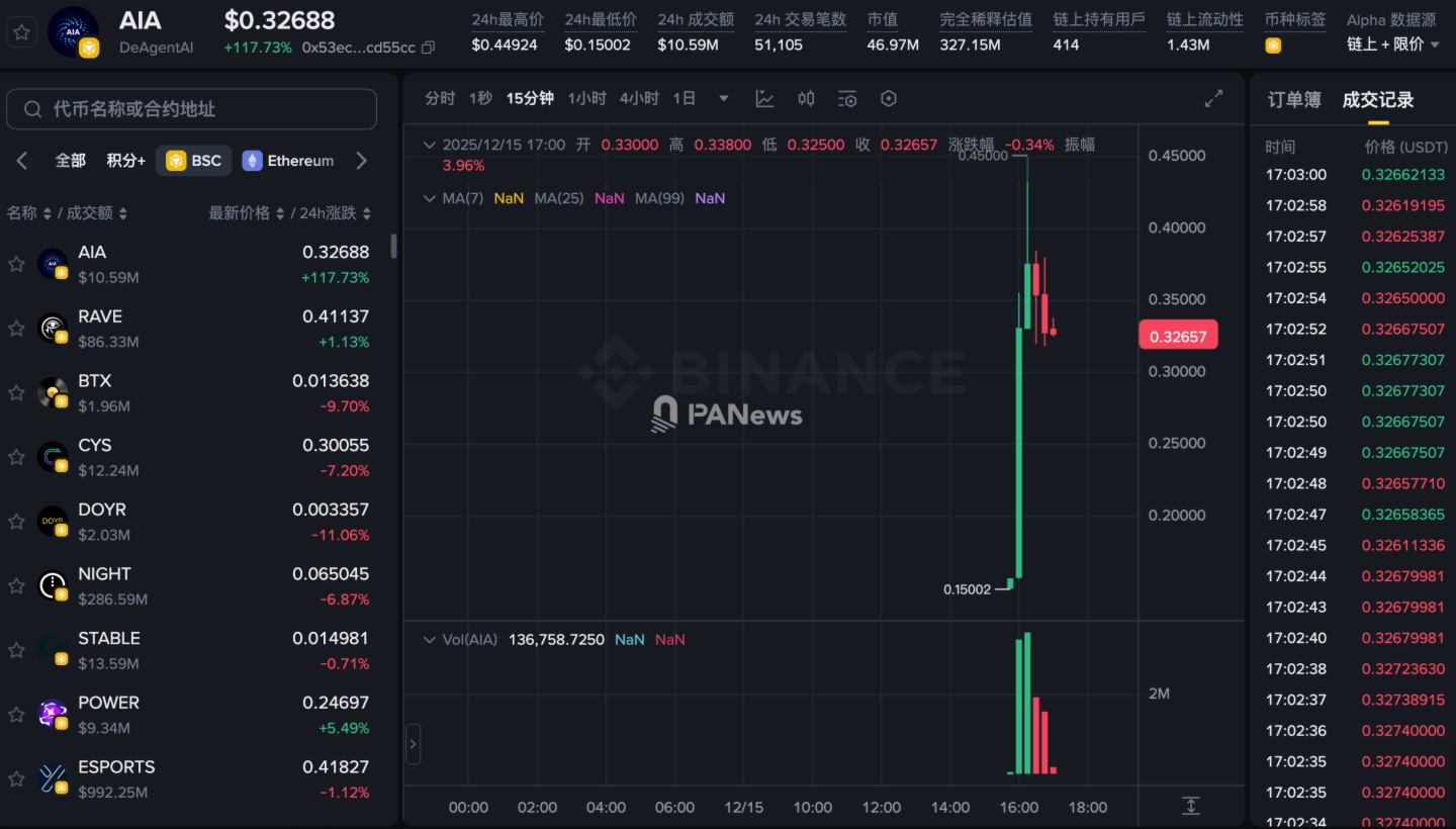 PANews 12月15日消息,据币安 Alpha官方数据显示,DeAgentAI (AIA) 已完成智能合约置换并于 12 月 15 日 16:00(UTC+8)正式恢复交易。行情显示,AIA 开盘后强势拉升,涨幅一度超过 160%,迅速登顶币安 Alpha 板块涨幅榜 Top 1。截至今日下午5时,AIA价格约为0.32美元,过去24小时涨幅为117.73%