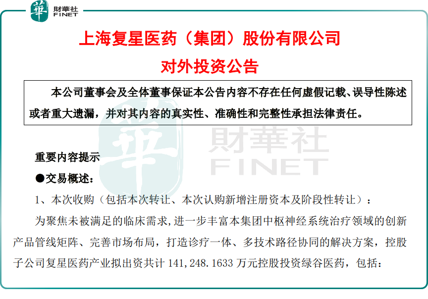 12月15日,复星医药重磅宣布,控股子公司复星医药产业与绿谷医药及其现有相关股东共同签订相关投资协议,拟出资约人民币14.12亿元控股收购绿谷医药。