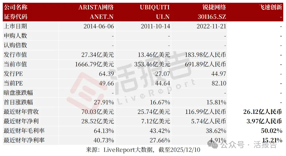 同行业IPO可比公司:ARISTA网络、UBIQUITI、锐捷网络