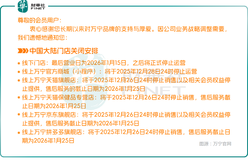 然而就在12月16日,这一市场却传来一则意外消息——中国香港健与美连锁品牌万宁(mannings)突然宣布:线下门店于2026年1月15日终止运营;线上官方商城(小程序)将于12月28日24时停运,天猫、京东(JD.US)、拼多多(PDD.US)等旗舰店则于12月26日24时停止销售,售后服务均延续至2026年1月25日。