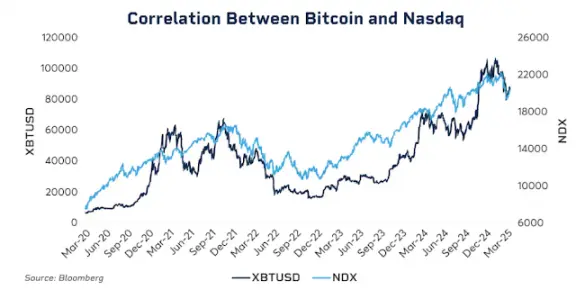 2025 年初,BTC 与纳斯达克 100 指数的 30 天滚动相关性一度达到 0.80,是 2022 年以来的最高水平。作为对比,2020 年之前,这个相关性常年在 -0.2 到 0.2 之间徘徊,基本可以视为不相关。
