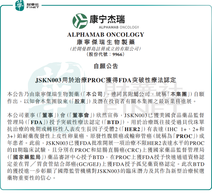 今日午盘收盘后,康宁杰瑞制药发布公告宣布,其JSKN003获美国食品药品监督管理局(FDA)授予突破性疗法认定(BTD),用于治疗既往接受过贝伐珠单抗治疗的晚期或转移性人表皮生长因子受体HER2有表达(IHC 1+、2+和3+)铂耐药复发性上皮性卵巢癌、原发性腹膜癌或输卵管癌(PROC)成年患者。