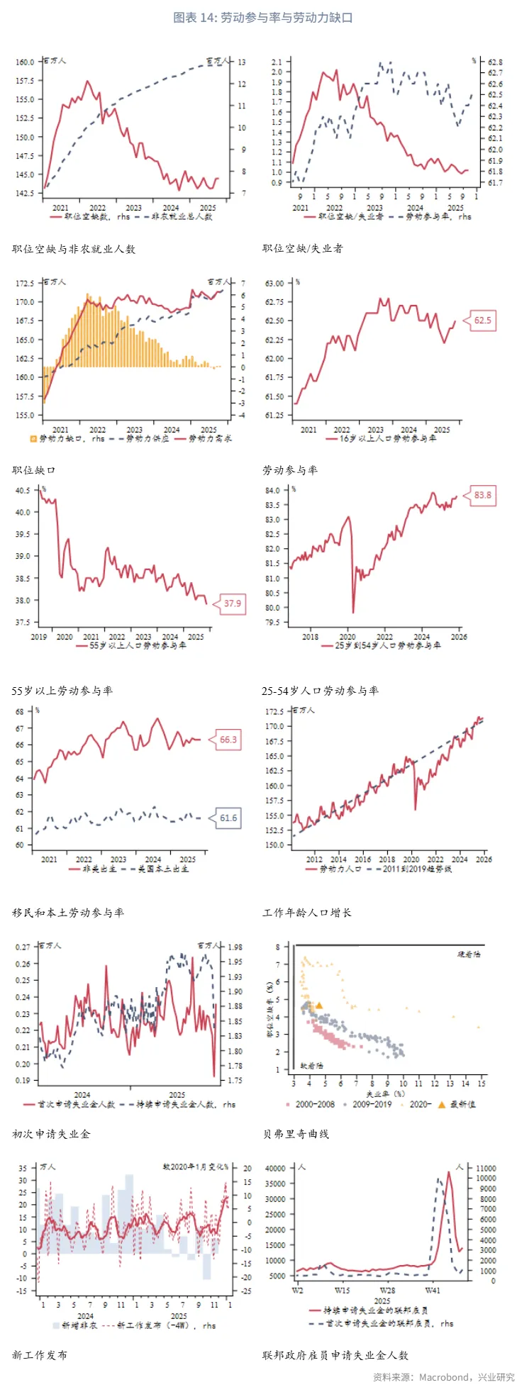 11月新增非农就业6.4万人好于预期,但失业率升至4.6%(2021年9月以来最高),时薪增速放缓。市场呈现“招聘放缓+劳动参与率回升”的组合,导致失业率上升。服务业仍是主引擎但内部分化,教育医疗业支撑增长,而休闲住宿业就业转负可能预示消费走弱。产品生产部门中,建筑业表现亮眼,制造业整体疲软。失业率上升主要源于重新进入劳动力市场及临时性失业(受政府停摆影响),而非临时性失业贡献为负,表明尚未出现大规模裁员潮。劳动参与率回升至62.5%,主要受25-54岁年龄段人口推动。