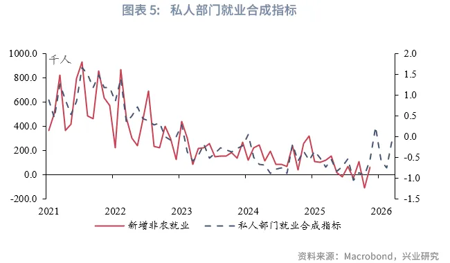我们将NFIB未来3个月计划增加招聘的小企业比例(-4M)、Revelio Labs新增就业、job indeed新工作发布、ADP就业四个指标标准化后等权合成(挑战者新增招聘指标由于同向变动概率较低,予以剔除),合成后指标相关系数0.85,同向变动概率58.62%,整体来看好于单个指标。合成指标显示,12月新增非常就业有望继续边际好转,但2026年初将再度回落,总体维持疲软态势。