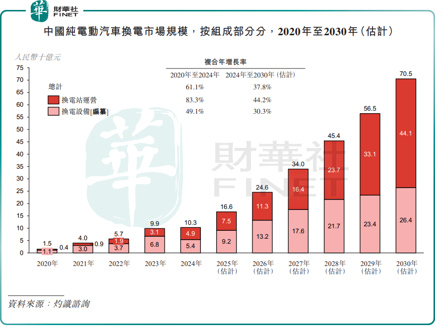 随着纯电汽车销量爆发,补能焦虑成为行业痛点,换电模式被视为关键解决方案之一。数据显示,中国换电行业市场规模已从2020年的15亿元增长至2024年的103亿元,预计到2030年将达到705亿元,2024年至2030年复合增长率高达37.8%。