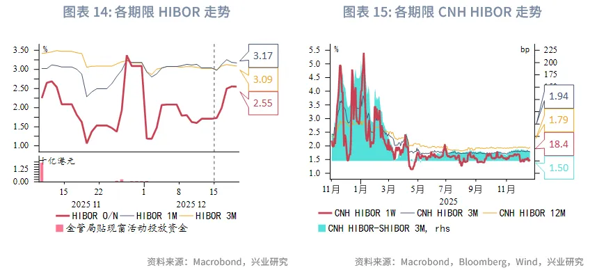 港元资金面:本周港元资金利率小幅走高。隔夜HIBOR上行84bps,1个月、3个月HIBOR小幅上行12bps和6bps。同期1个月和3个月期限的港美利差小幅上行19bps和11bps,目前维持在74bps和98bps。展望后市,受跨年结算压力和假期效应驱动,预计HIBOR预计高位震荡到年初。