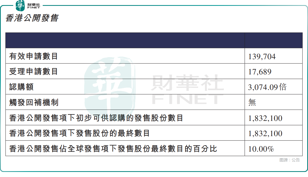 根据资料,香港公开发售方面,翰思艾泰获3074.09倍认购,公开发售股份最终数目为183.21万股股份,占发售股份总数的约10%。获得约13.97万份有效申请,受理申请数目17689份,一手中签率约为1%。