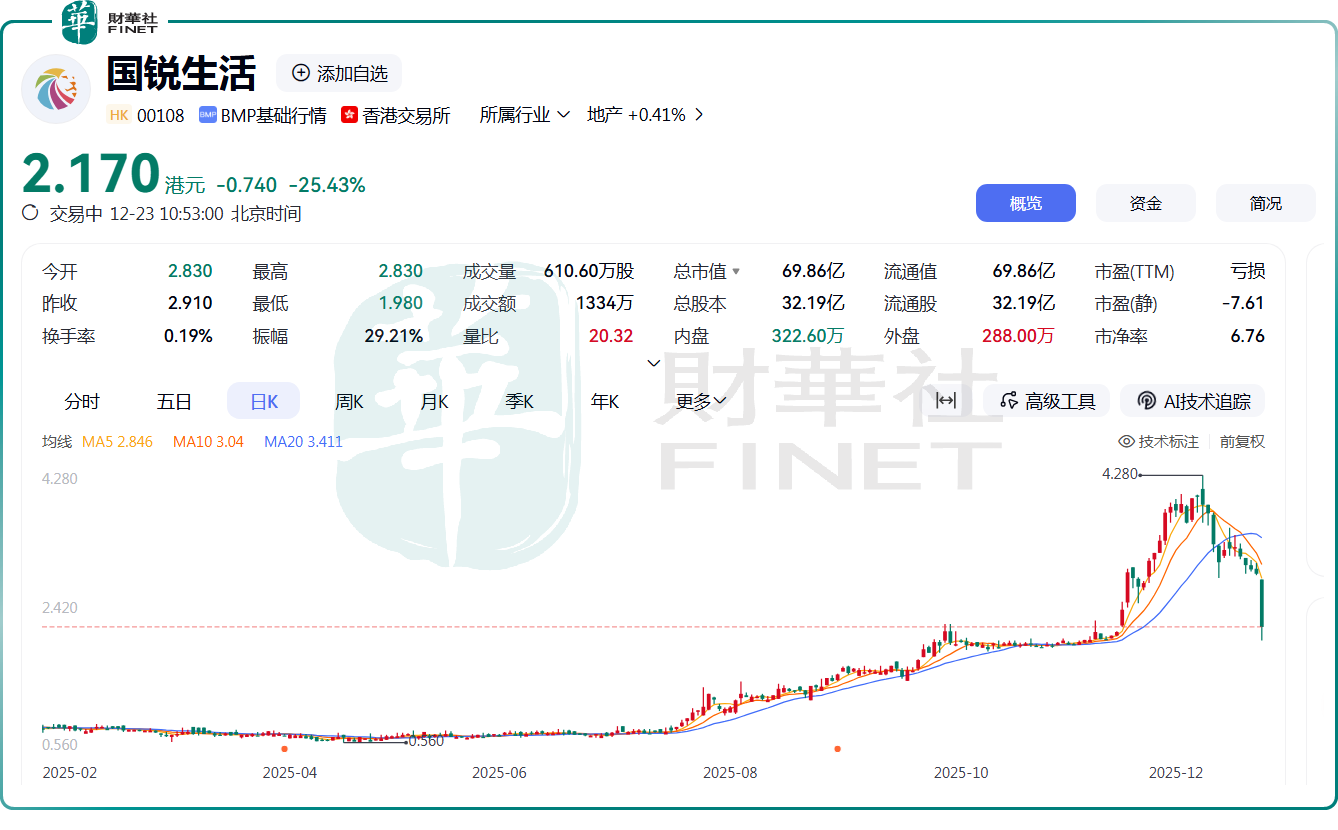 12月23日,国锐生活(00108.HK)股价大幅跳水,一路下探,跻身当日港股跌幅榜前列;截至发稿前,该股跌幅达25.43%,报2.17港元/股。