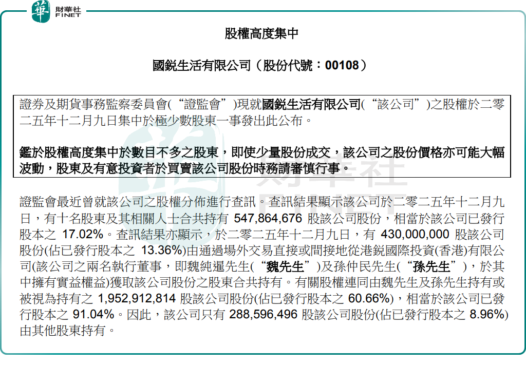 据香港证监会发布,证监会最近曾就国锐生活之股权分布进行查讯。