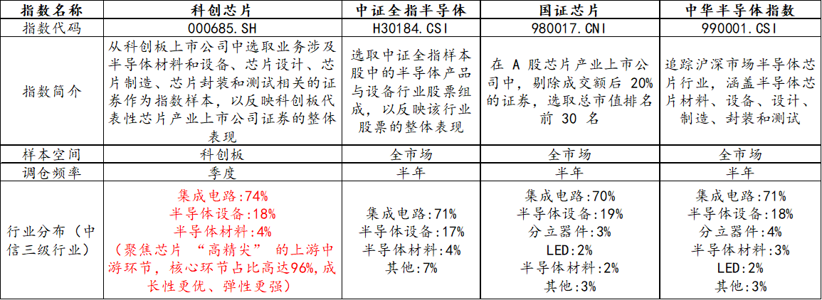 市场上芯片相关指数众多,选取当下热门的科创芯片、半导体等指数进行比较,可以发现,虽然均聚焦为芯片板块,但在指数编制上却大有不同。一句话总结:科创芯片指数聚焦芯片核心环节,“含芯量”更高,弹性强,成长性高。