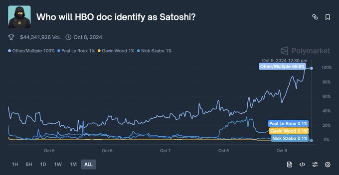 HBO《Money Electric: The Bitcoin Mystery》上映前后,Polymarket 上的一个合约被视为“叙事与事实脱节”的经典样本:“Who will HBO identify as Satoshi?”。(2024年,10月)