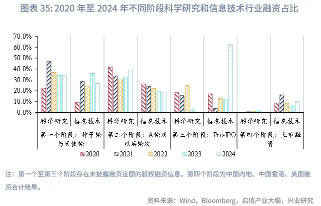 从近五年来看(2020年至2024年),科学研究和技术服务业的融资规模在本阶段全部融资中的占比先降后升,先是从2020年时的39.0%下行至2022年的30.1%,随后回升,到2024年该占比上行至39.2%。信息传输、软件和信息技术服务业的融资占比整体回落,从2020年时的26.4%上行至2024年的18.7%。制造业的融资占比整体上升,从2020年时的16.3%上行至2024年的31.9%。