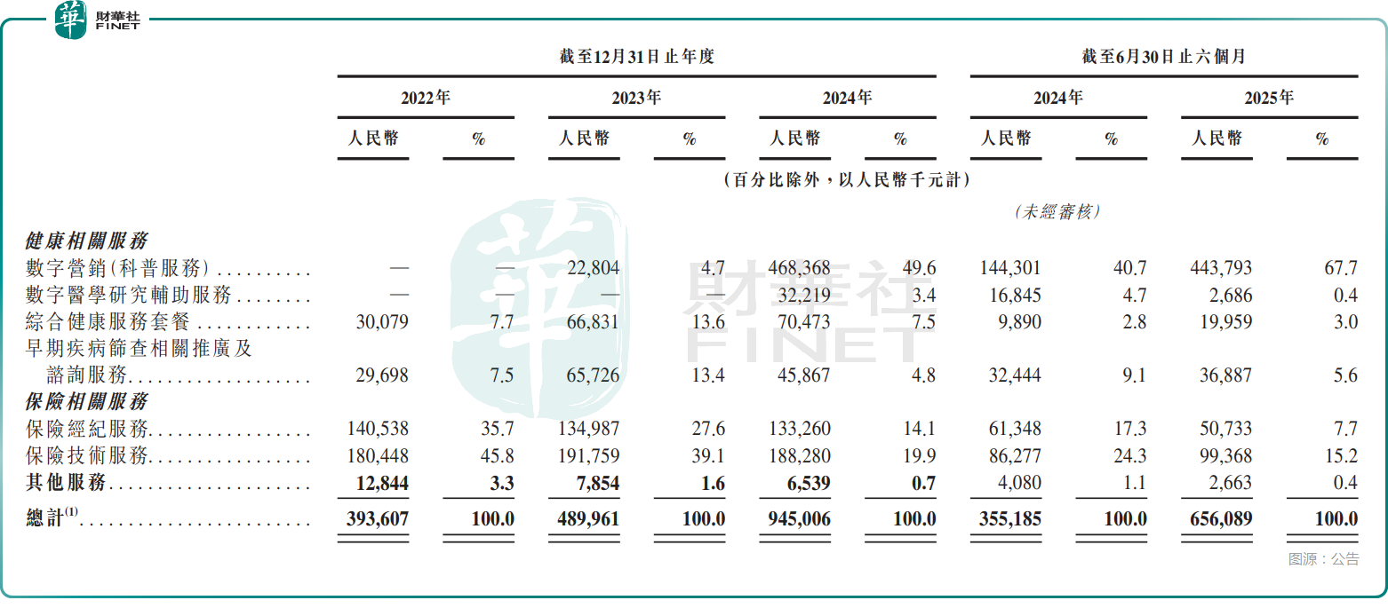 之所以能取得行业领先地位,一定程度上源于轻松健康以“健康相关服务+保险相关服务”双支柱模式为核心,构建了覆盖全生命周期的健康保障生态。其中,健康相关服务涵盖数字营销(科普服务)、数字医学研究辅助、综合健康服务套餐、早期疾病筛查相关推广及咨询服务等,保险相关服务则包括保险经纪服务与保险技术服务,形成了“预防-诊疗-保障”的一站式服务闭环。