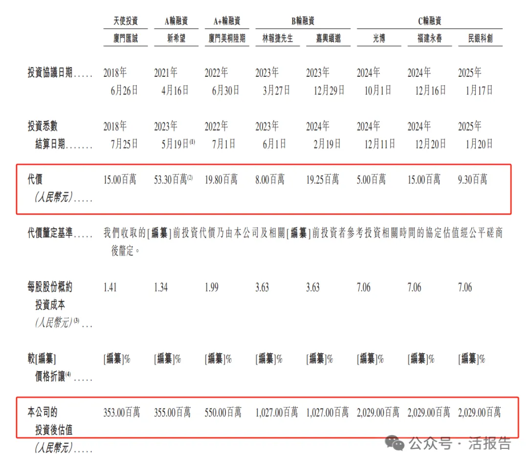 公司共计进行过五轮融资。在2024年12月的C轮融资中,公司的投后估值约20.29亿人民币。