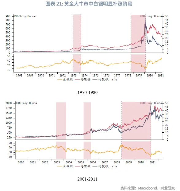 历史来看,在布雷顿森林体系解体后的两轮黄金大牛市中,每轮都会出现几次白银的明显补涨行情,体现为同期金银比的持续下行。从持续时长来看,持续时长在1至3年不等。