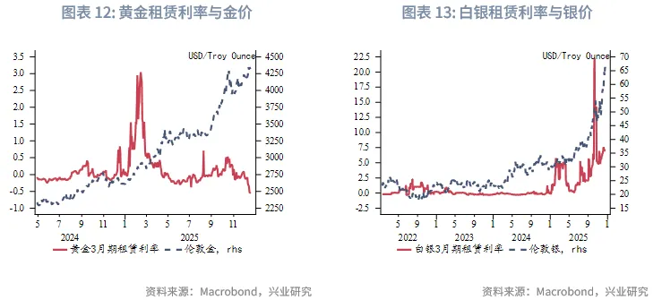 步入第四季度,美国政府关门、欧日政坛动荡,伦敦白银现货紧张、白银租赁利率大幅飙升共同推升贵金属价格。伦敦银一度相对于纽约银溢价,引发套利交易,纽约以及亚洲地区的白银均涌向伦敦,白银租赁利率自10月13日之后出现回落,不过市场投机热情仍然高涨。10月17日,国内外交易所集体上调黄金白银保证金比例,黄金白银价格高位回落,上涨走势告一段落。此后黄金经历了两周的快速调整,在3900至4000美元/盎司长线配置买盘涌现金价企稳,后再度上行,12月在白银铂金集体大涨背景下黄金于下旬一路突破4400、4500美元/盎司。