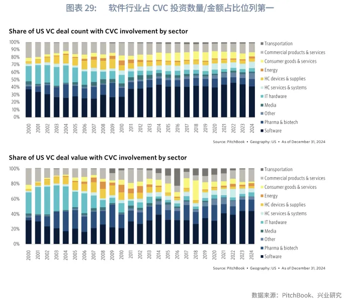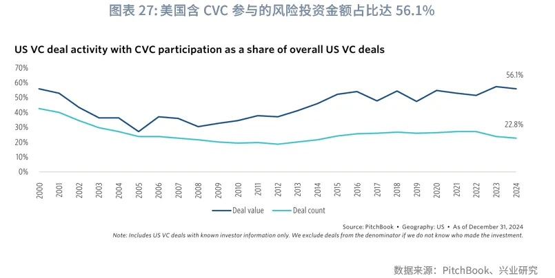 企业风投者(CVC, Corporate Venture Capital)构建了独特的创新模式,各个行业巨头绕其产业链进行布局,实现构建生态系统、锁定技术标准并保障供应链安全。从投资偏好来看,企业风投者更加侧重于投资成熟的初创企业,通过更成熟的产品开发来降低投资风险,注重战略协同而非短期的财务回报。在2014-2024年间,含企业风险投资参与的交易额占美国风险投资总额的46%以上,数量占比在21%以上。这些产业资本虽然越来越多地参与早期投资,但仍保持对成熟初创企业较大的投资比重。