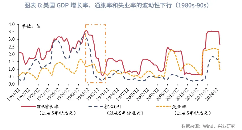 20世纪80年代初期,美联储主席保罗·沃尔克通过激进加息成功遏制了高通胀,为美国经济奠定了低通胀的长期基础。与此同时,美国经济结构正经历从传统制造业向服务业与科技产业的关键转型:在“里根经济学”推动的供给侧改革下,企业税负降低、管制放松,激发市场活力;随后克林顿政府大力推动“信息高速公路”战略,标志着信息技术从新兴产业发展为国家主导产业,产业结构向高附加值、知识密集型升级。这一进程与经济全球化深度融合,共同推动美国进入以“高增长、低波动”为特征的“大稳健”时期。