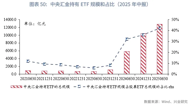 根据前十大持有人统计,截至2025年6月底,中央汇金合计持有股票ETF市值达1.28万亿元,占全市场股票ETF总规模的42.2%。自2024年以来,中央汇金显著加大了对中证1000ETF、创业板指ETF和科创50ETF等小盘与成长风格品种的配置力度,逐步构建起“以沪深300为压舱石,兼顾小盘与科创风格”的均衡配置格局。
