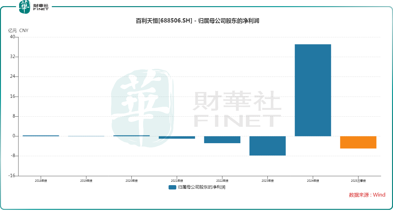 财务数据显示,百利天恒近年的业绩呈现“脉冲式”特征:2024年凭借与BMS合作的8亿美元首付款,实现营业收入58.23亿元,归母净利润37.08亿元,业绩暴增的同时实现了扭亏为盈;但进入2025年,一次性授权收入褪去后,业绩再度转亏,前三季度归母净利润亏损4.95亿元。
