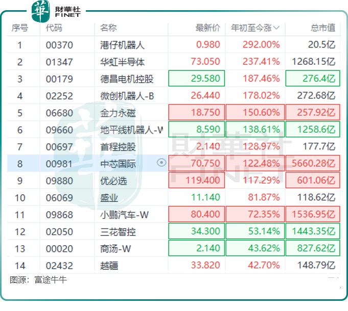 资本市场也给予了热烈反馈。富途牛牛数据显示,年初至今,机器人板块中的港仔机器人(00370.HK)和华虹半导体(01347.HK)股价累计翻超2倍;微创机器人(02252.HK)、地平线机器人(09660.HK)、优必选等热门股也均涨超100%。