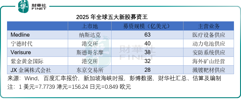 综合来看,今年IPO市场募资规模最大的是Medline,其次为宁德时代,第三大是欧洲安防巨头Verisure,第四大是紫金矿业(02888.HK)分拆的紫金黄金国际,第五大是日本的JX金属株式会社,见下表。