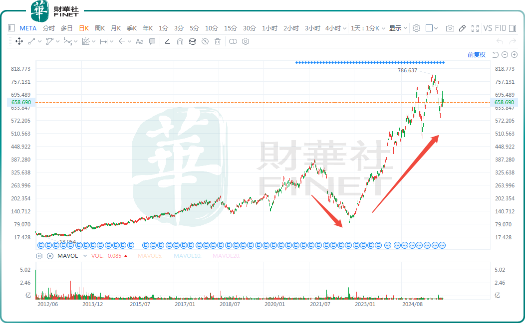 从目前在AI时代取得的成绩来看,Meta的股价早已爬出了押注元宇宙带来的深坑,并在近年持续飙涨,频创新高,整体表现并不差。