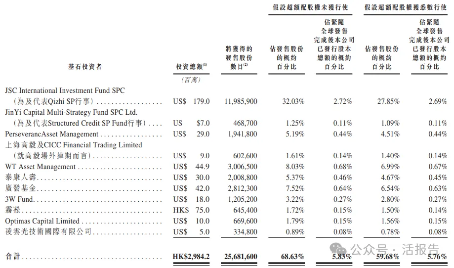 公司本次以18C规则上市,因而公开发售初始占5%,最高可回拨至20%。国配引入11家基石投资者(璟泉启智、WT资管、高毅资产、泰康人寿、3W Fund、中庸资本、雾凇资本、清华大学教育基金会、凌云光),认购约29.84亿港元,占全球发售股份的68.63%。