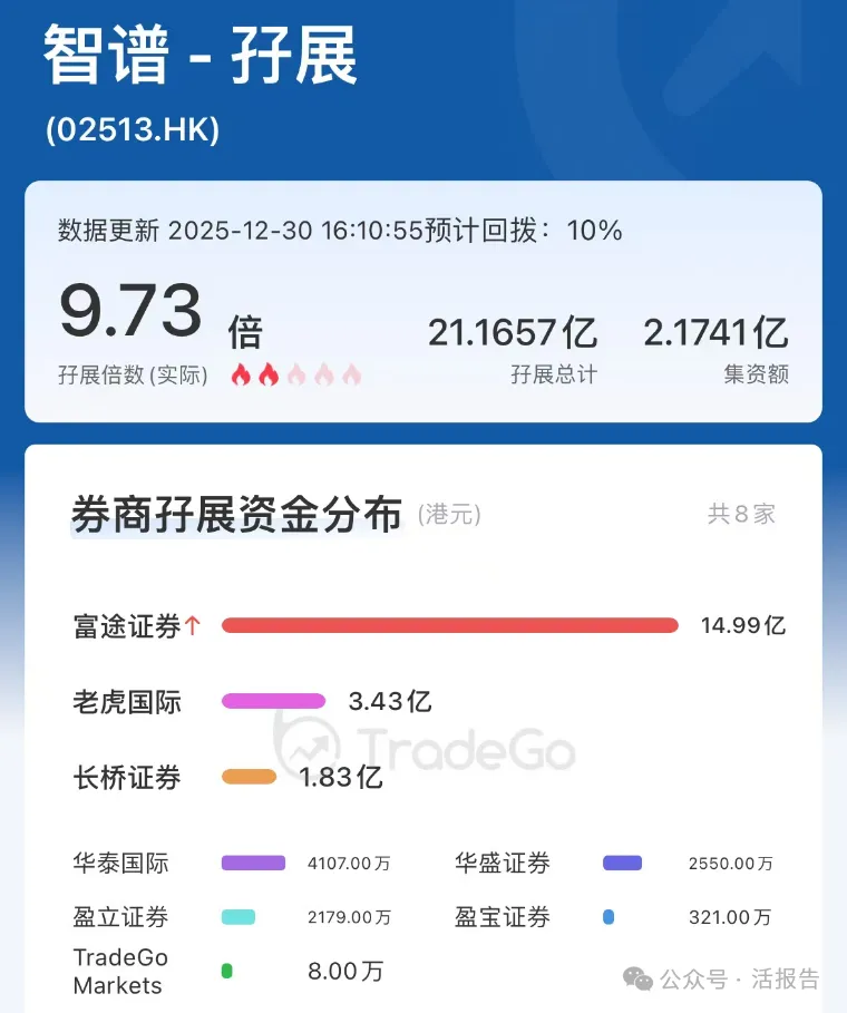 据TradeGo新股孖展数据,截至12月30日17时,智谱孖展总额已达21.17亿港元,孖展认购倍数约9.73倍,首日认购已足额。