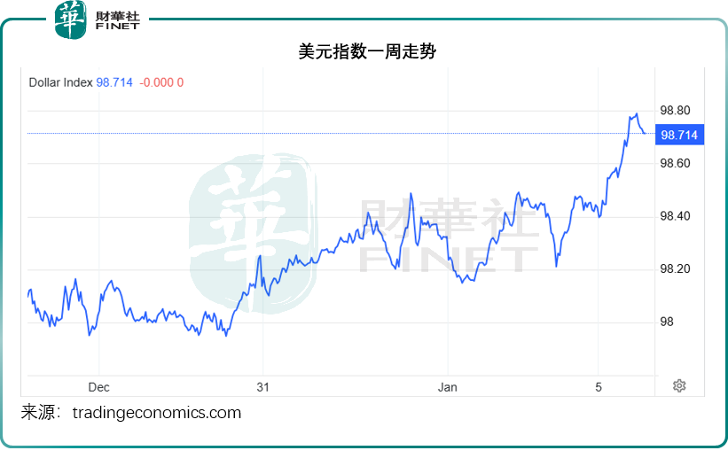 委内瑞拉事件后,美元指数一度上扬,见下图,美元指数曾升至贴近98.80水平,但现在回落至98.7左右。