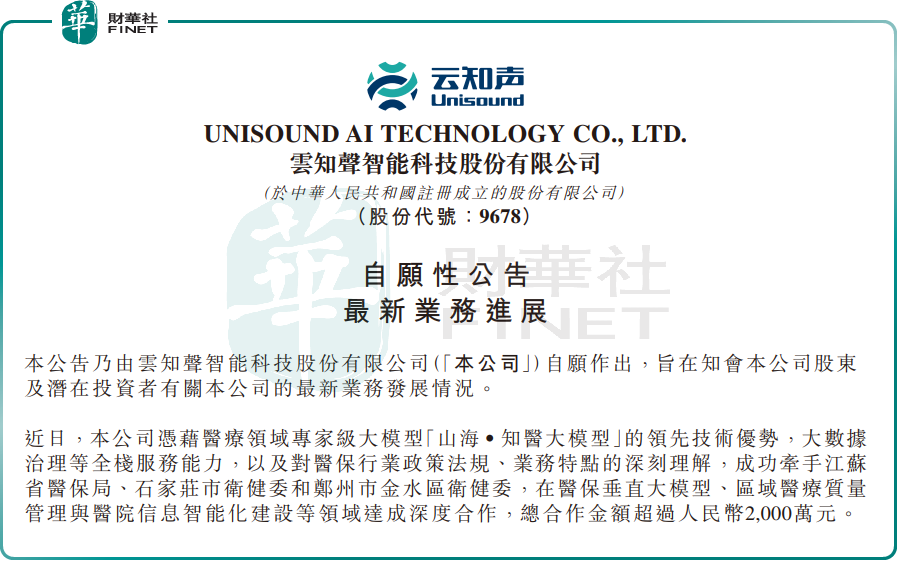 2026年1月5日,云知声发布公告宣布,近日,公司凭借医疗领域专家级大模型「山海‧知医大模型」的领先技术优势,大数据治理等全栈服务能力,成功牵手江苏省医保局、石家庄市卫健委和郑州市金水区卫健委,在医保垂直大模型、区域医疗质量管理与医院信息智能化建设等领域达成深度合作,总合作金额超过人民币2000万元。