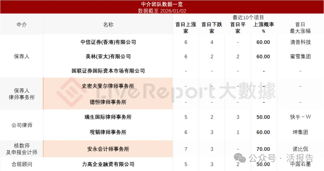 据LiveReport大数据统计,景旺电子中介团队共计9家,其中保荐人3家,近10家保荐项目数据表现缺乏亮点;公司律师共计2家,综合项目数据表现有待加强。整体而言中介团队历史数据表现普通。