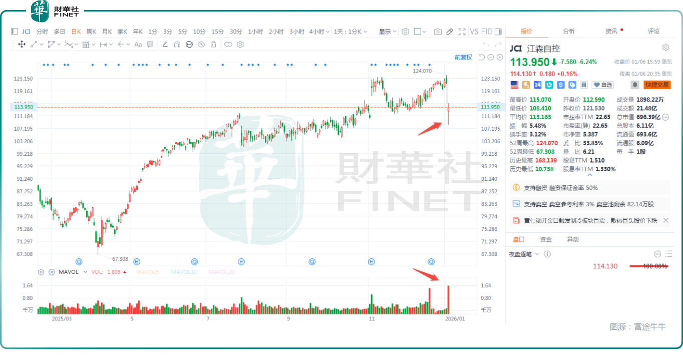 数据显示,周二(美东时间),江森自控(JCI.US)一度暴跌近11%,创2022年以来最大盘中跌幅,最终跌幅收窄至6.24%,但成交量出现显著放大;摩丁制造(MOD.US)也爆量收跌7.46%;特灵科技(TT.US)同样走低。